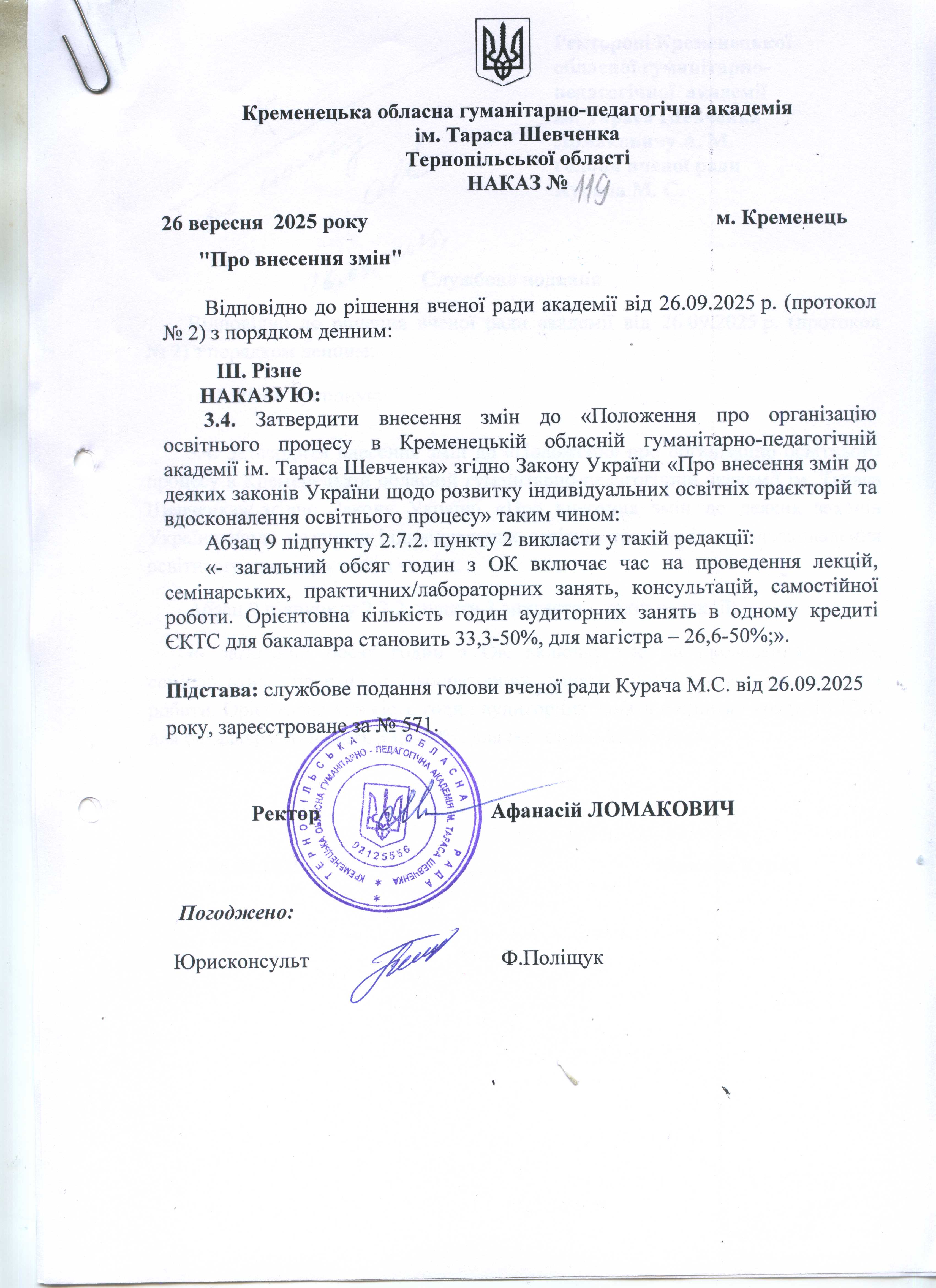Регламент Вченої ради Кременецькій обласній гуманітарно-педагогічній академії ім. Тараса Шевченка (зі змінами та доповненнями).